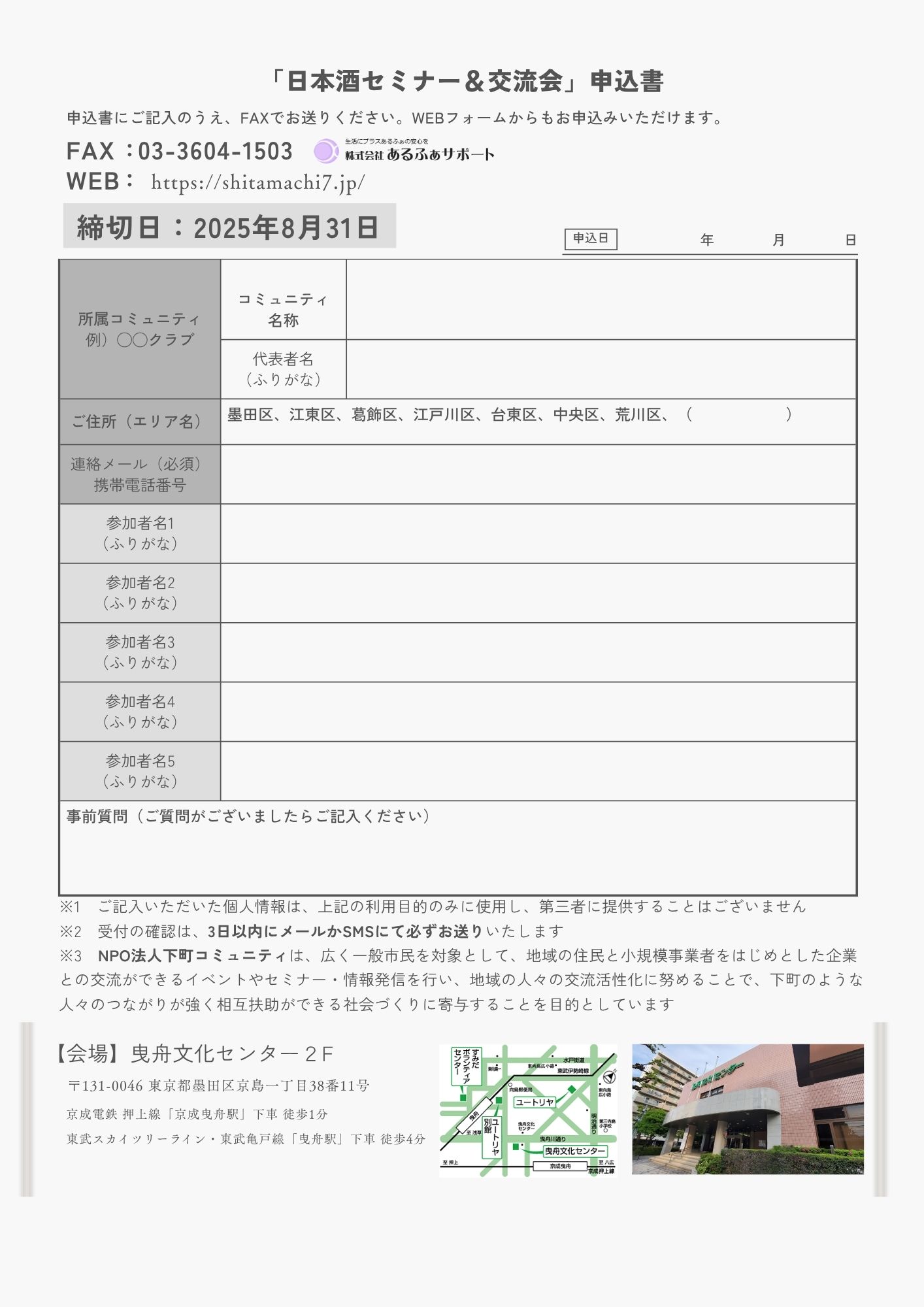 案内チラシ 概要 日時:9月11日(木) 18時~20時半 (受付17時半~) 場所:曳舟文化センター 2F 東京都墨田区京島1丁目38−11 申込 下記フォームより入力して頂くか、申込書に記載の上でFAXで申込ください。 FAX申込はこちら 申込フォーム Facebook Twitter はてブ Pocket Feedly